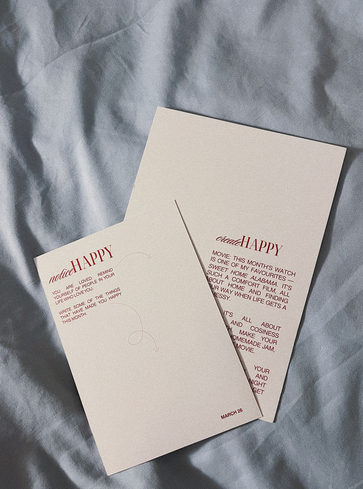 - a personal letter, with a note from me and stories of happy moments from others in the Happy Post community